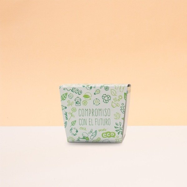 El diseño de la maceta es estándar, pero permite personalizar una de sus caras con el logo de tu marca.
